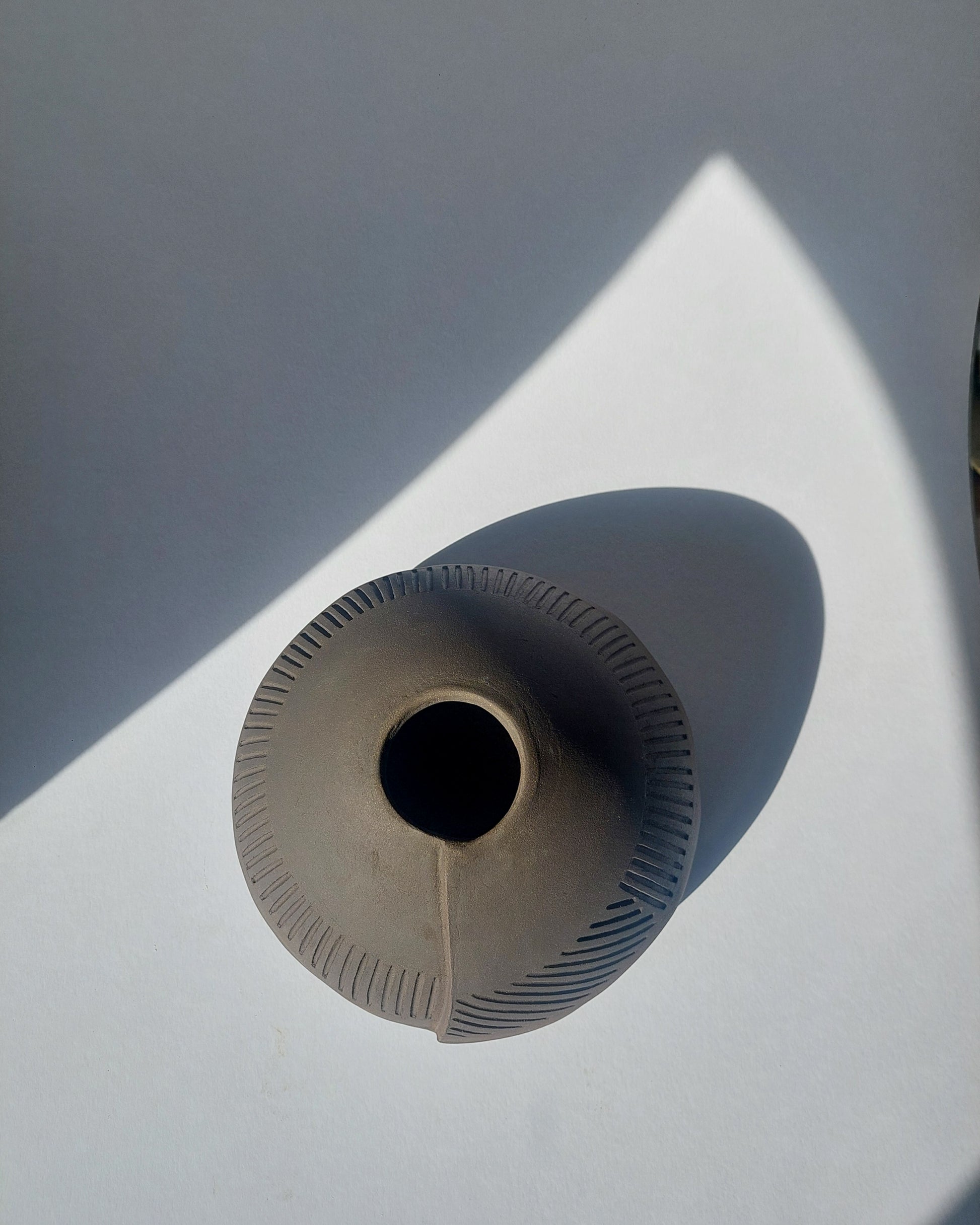 This vase, made from black clay, has a natural exterior that preserves its raw texture and deep tone, giving the piece a rustic and authentic charm. The interior is carefully glazed, offering an elegant contrast between the matte finish outside and the smooth glossy interior. The carved lines around the surface add an artistic dimension, balancing simplicity with sophistication. Perfect for enhancing any space, whether as a functional or decorative piece.