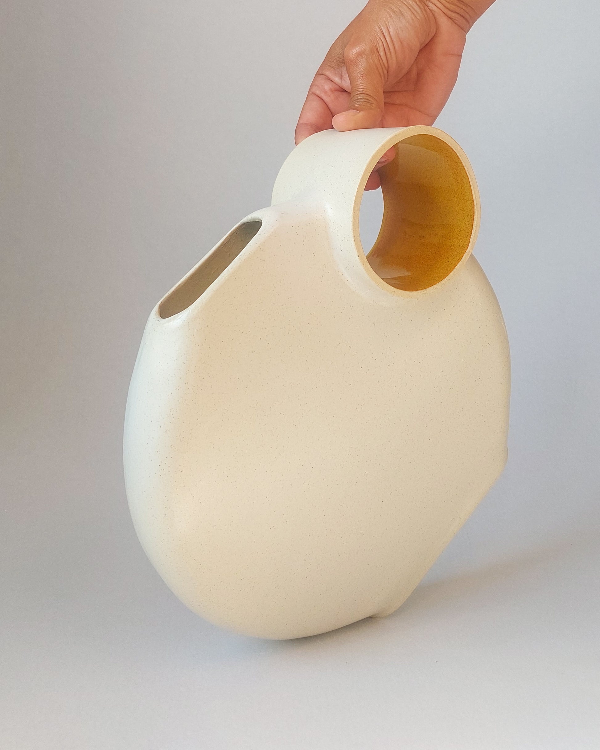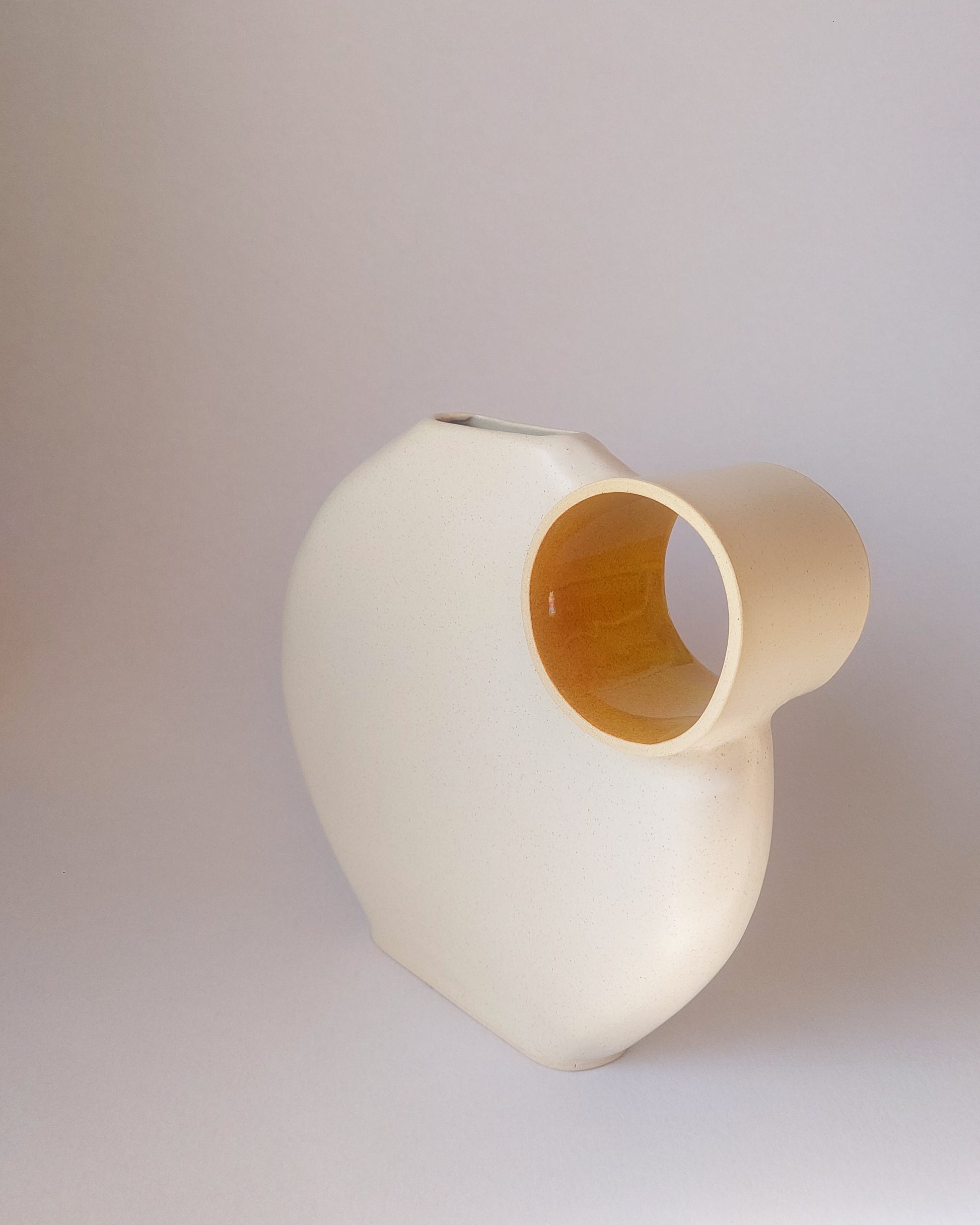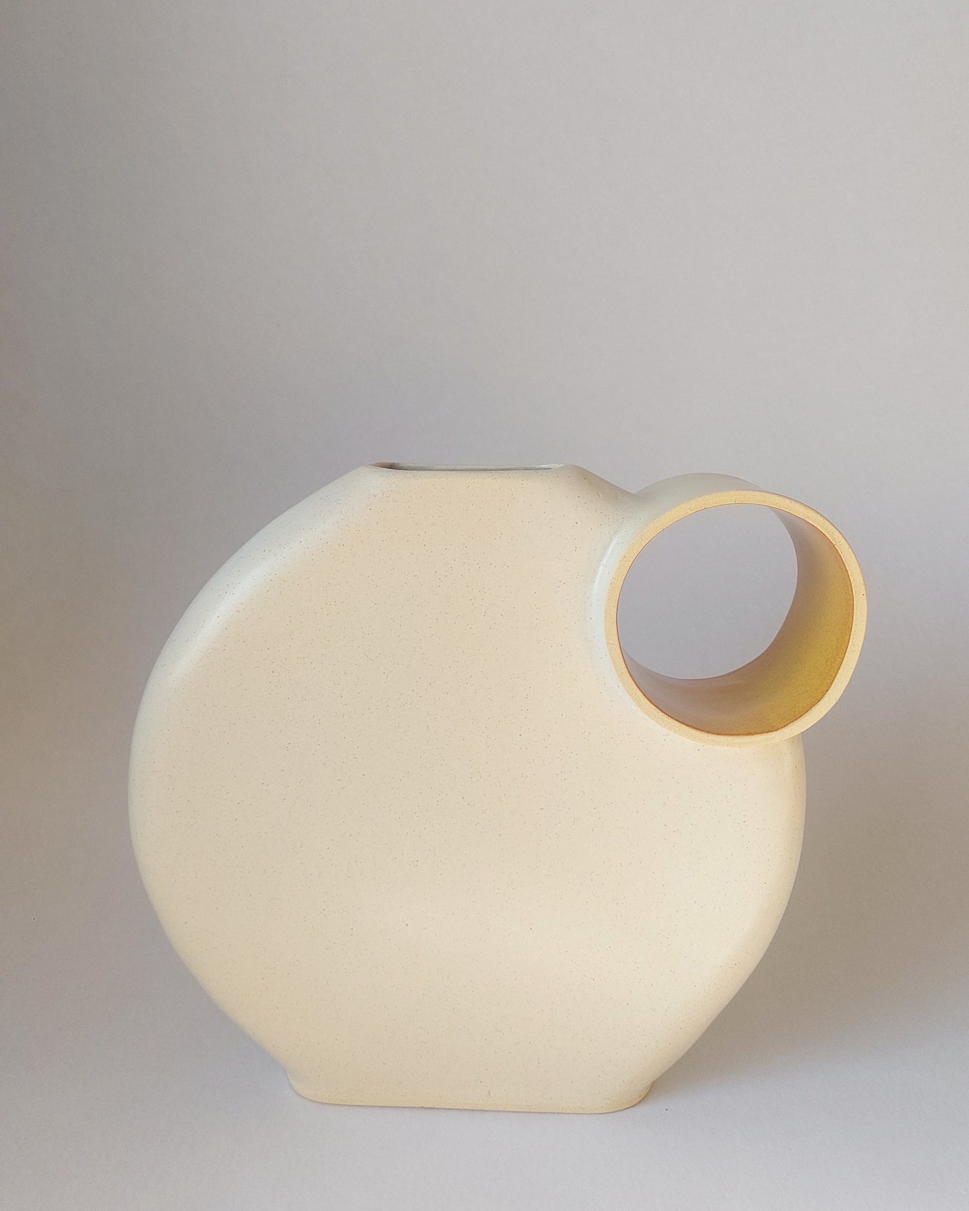 This handcrafted vase captivates with its minimalist design and organic shapes. The circular opening adds a unique touch of lightness and modernity, making it a striking centerpiece for any decor. Perfect for those who value elegance and authenticity in contemporary spaces.