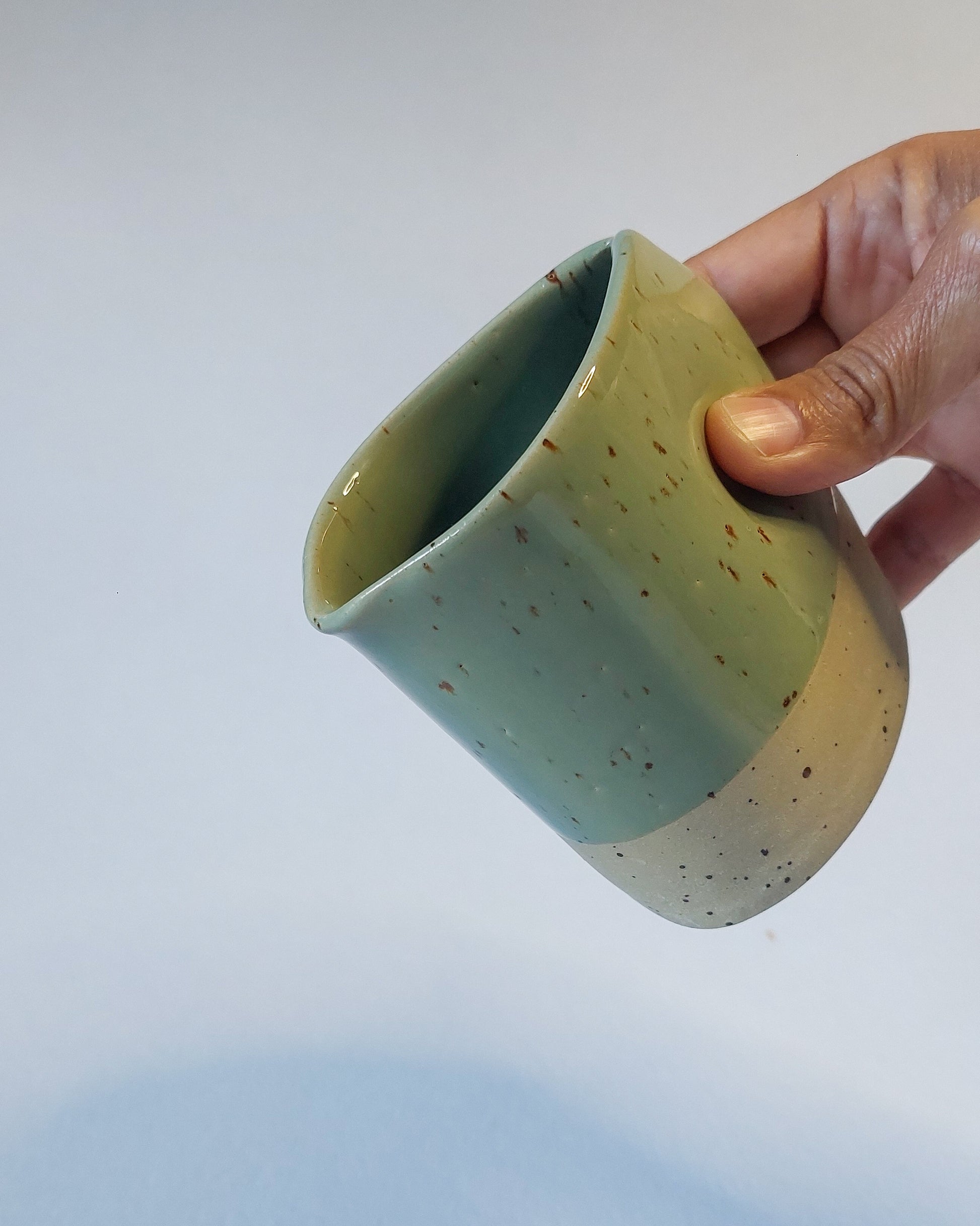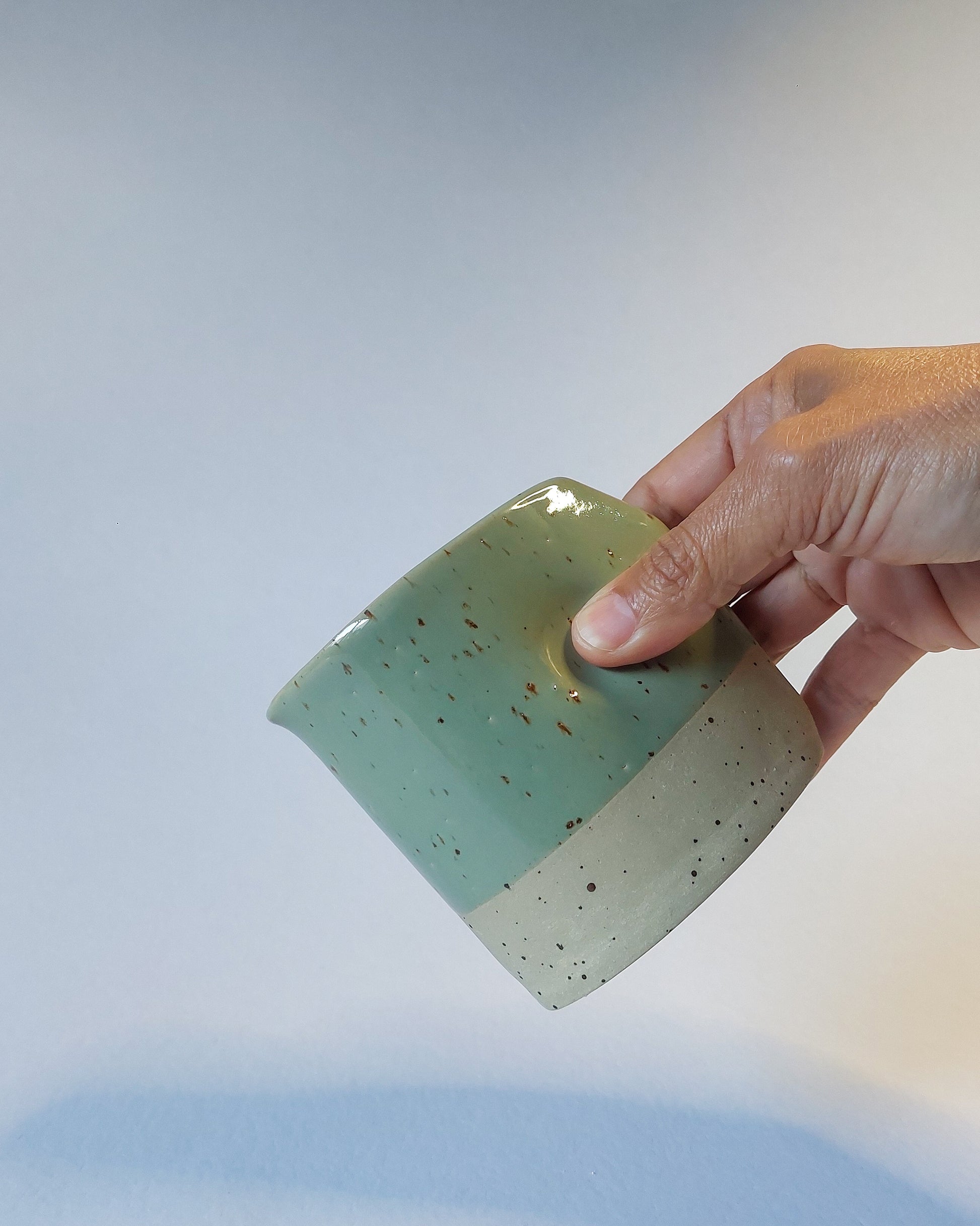 This handcrafted milk jar blends contemporary design with an organic touch. Its clean lines and the subtle fusion of colors — soft green on top and natural clay at the base — create a minimalist aesthetic, perfect for modern settings. Made using the handbuilding technique, each piece is unique, with slight variations that emphasize its authenticity. Crafted from high-temperature clay, it ensures durability and strength, making it suitable for both microwave and dishwasher use. Ideal for serving milk, sauces, or as a decorative item, its functional yet elegant form adds sophistication to any table.