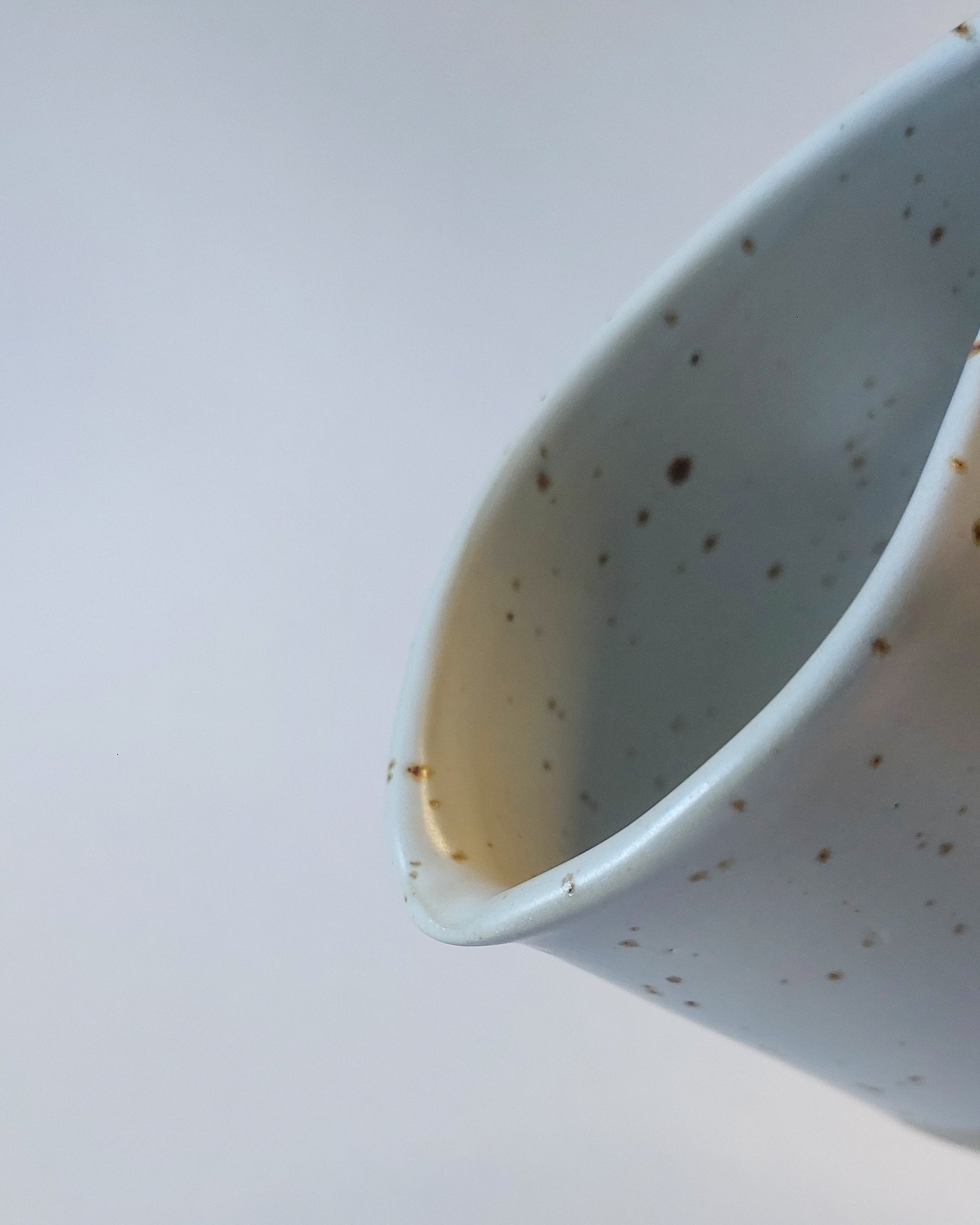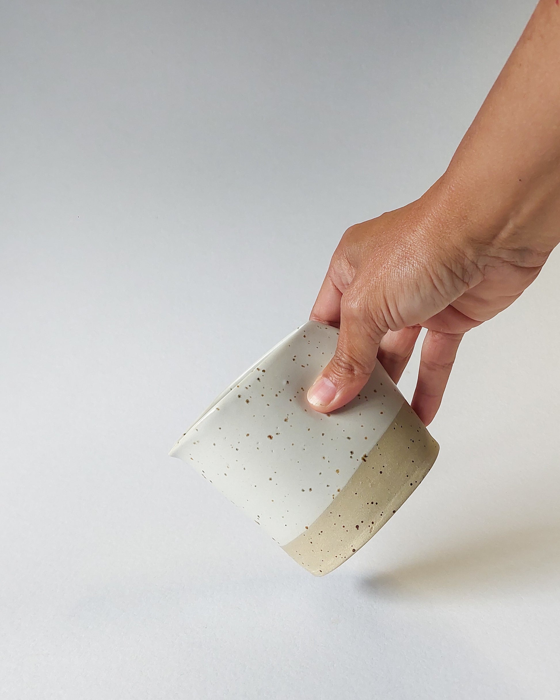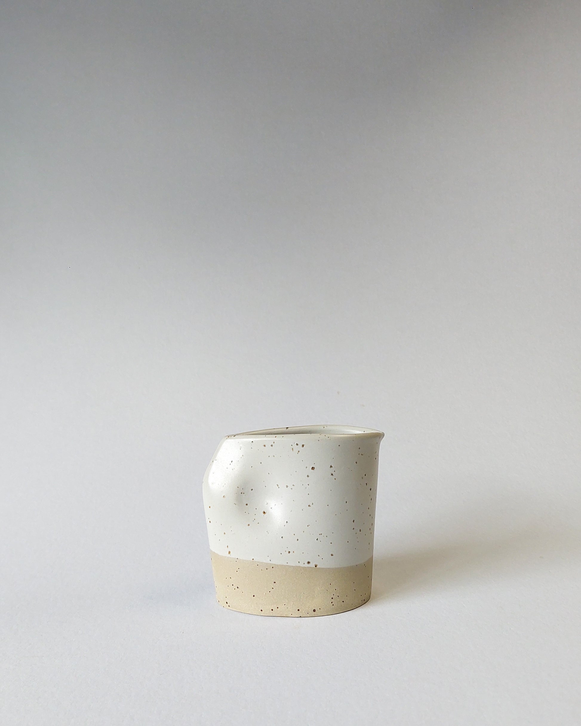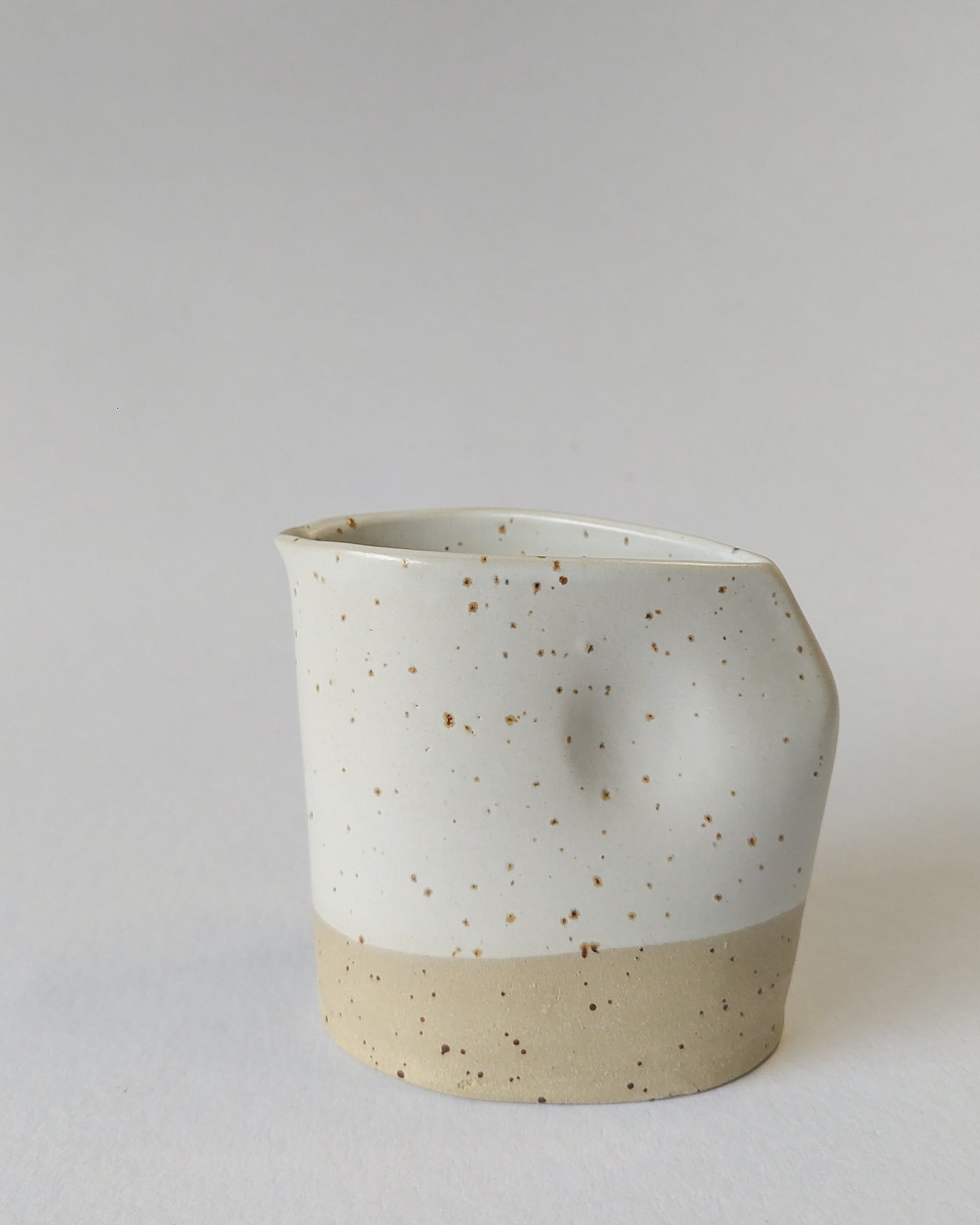This handcrafted milk jar blends contemporary design with an organic touch. Its clean lines and the subtle fusion of colors — white on top and natural clay at the base — create a minimalist aesthetic, perfect for modern settings. Made using the handbuilding technique, each piece is unique, with slight variations that emphasize its authenticity. Crafted from high-temperature clay, it ensures durability and strength, making it suitable for both microwave and dishwasher use. Ideal for serving milk, sauces, or as a decorative item, its functional yet elegant form adds sophistication to any table.